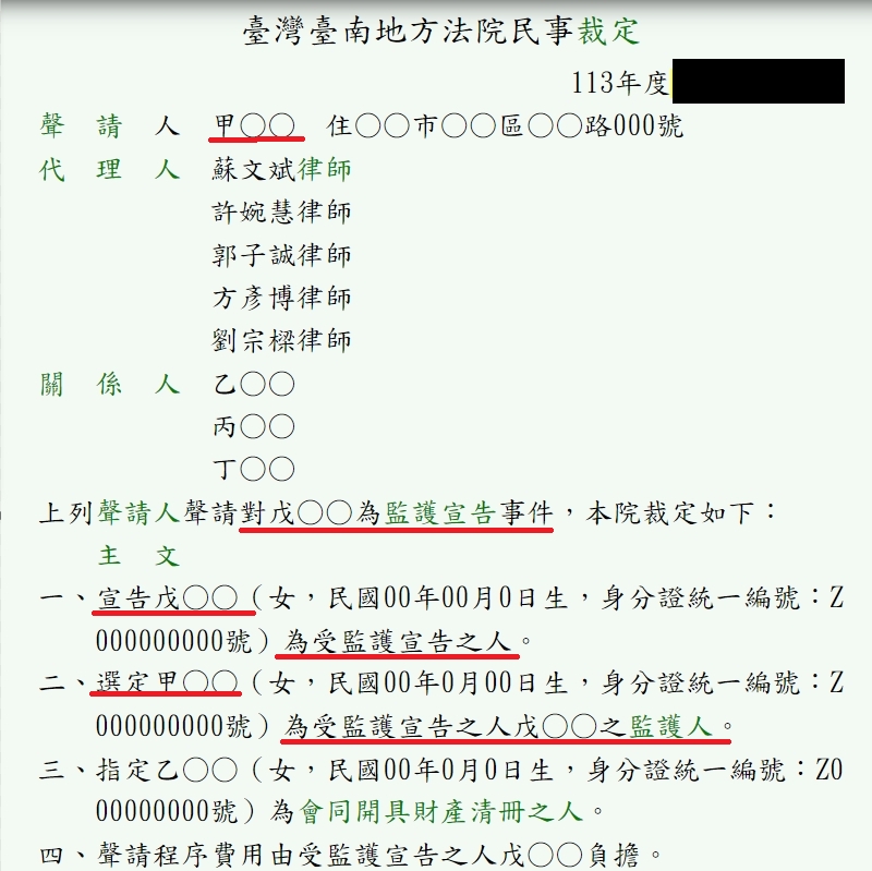 今天想和大家分享一個關於監護宣告的案例。甲女和乙女是一對母女,甲女因年事已高並患有失智症,乙女為了避免母親在法律上因無法自行決定而受損,於是委託我們蘇文斌律師團隊(我在法律事務所)協助進行監護宣告聲請。